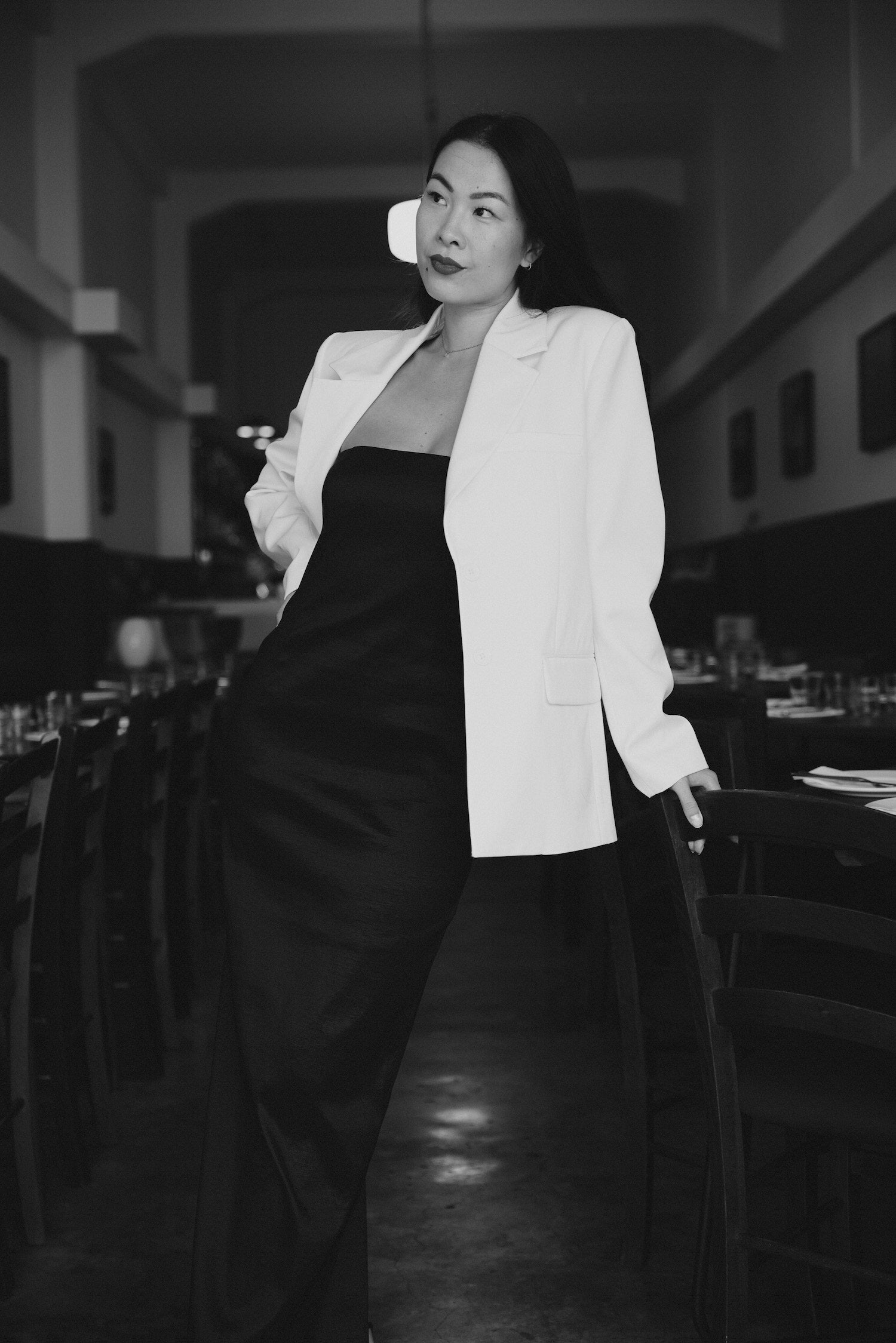 Tiffany wears the Rebe Blazer, Strapless Dress & Elle Heel